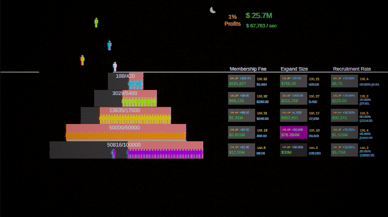 At the risk of angering the Pyramid, I noticed just a couple of UI bugs... If you hover over either the Membership Fee header text or Recruitment Rate header text, then the tooltip * associated SFX flicker rapidly. Also part way through my playthrough (nearly on hour...had to stop, I've got work in the morning lol) i noticed the 200 End Them All message appear. When hovering over it i think the tool tip appears hidden beneath the bottom most tier Recruitment Rate button, so never worked out what that bit was all about.